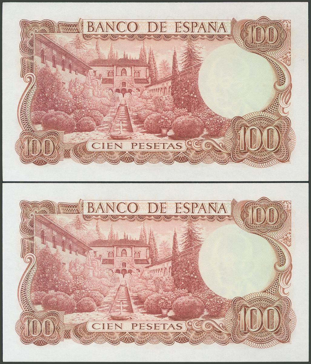 100 Pesetas. 17 de Noviembre de 1970. Pareja correlativa. Serie D. (Edifil 2017: 472b). Apresto original. SC.