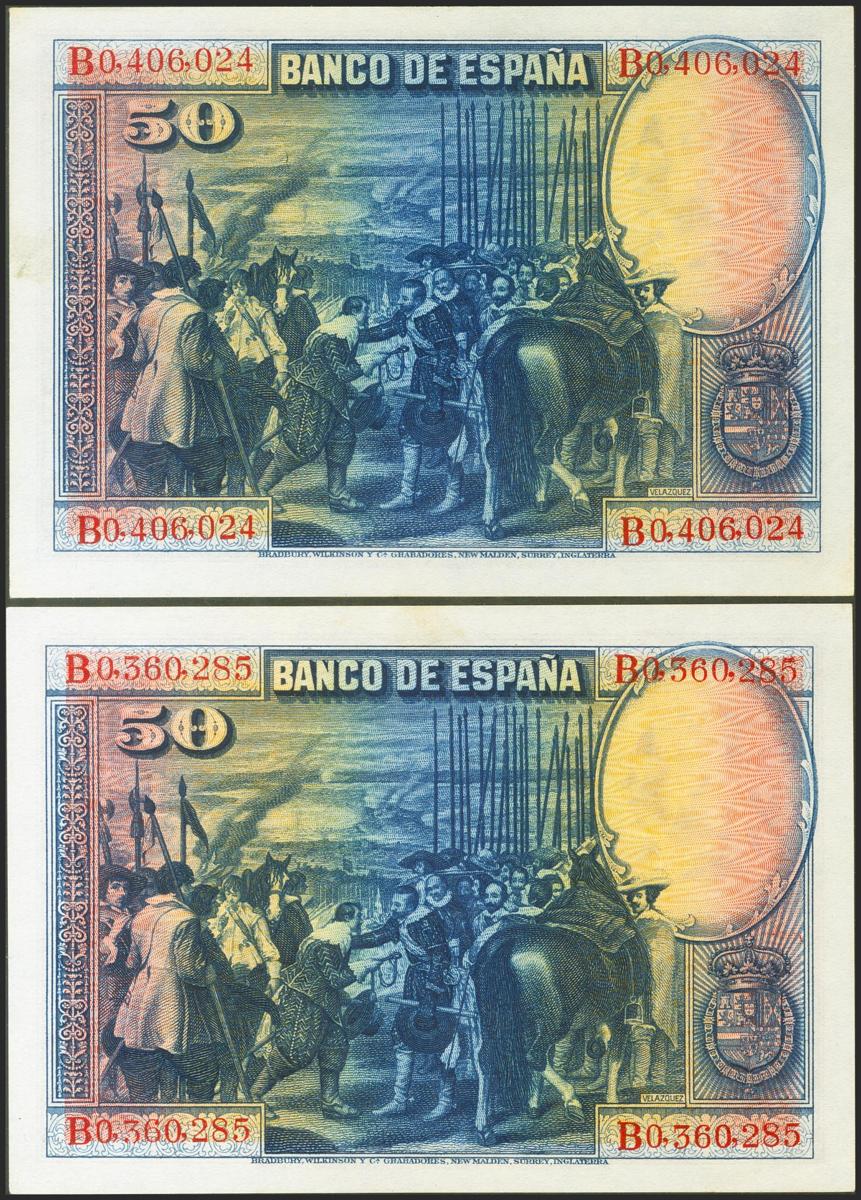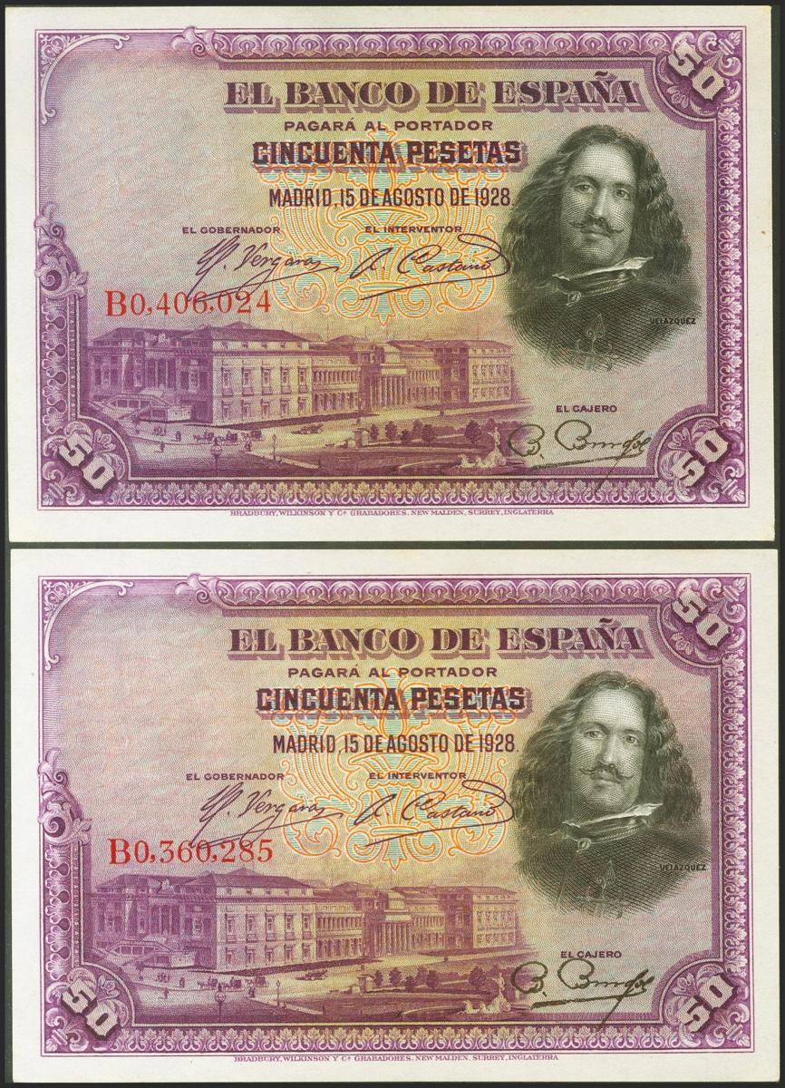 Conjunto de 2 billetes de 50 Pesetas emitidos el 15 de Agosto de 1928, con la serie B (Edifil 2021: 354), conservan parte de su apresto original. SC/SC-.