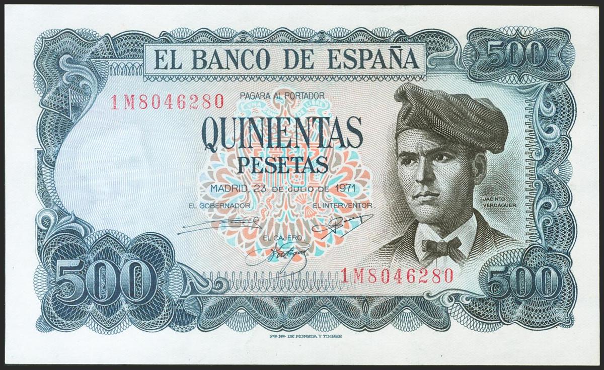 500 Pesetas. 23 de Julio de 1971. Serie 1M. (Edifil 2021: 473a). Apresto original. SC-.