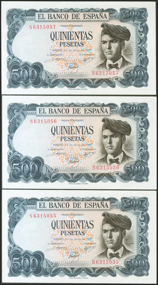 500 Pesetas. 23 de Julio de 1971. Trío correlativo. Serie S. (Edifil 2021: 473a). Conserva gran parte del apresto original. SC-.