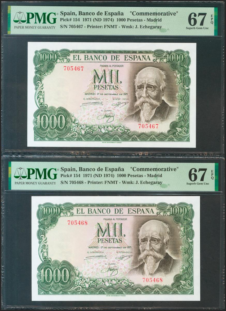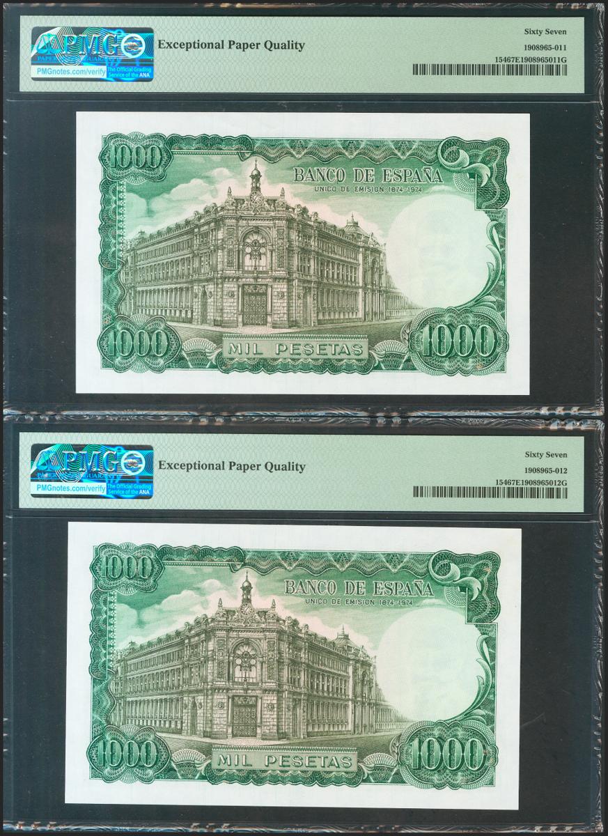1000 Pesetas. 17 de Septiembre de 1971. Pareja correlativa. Sin serie. (Edifil 2021: 474, Pick: 154). Rarísima en esta calidad, apresto original. SC. Encapsulado PMG67EPQ, ambos.