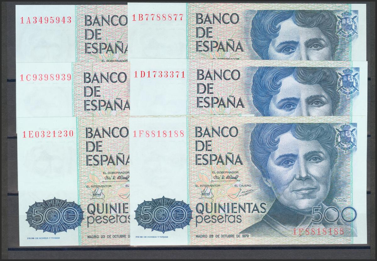 Precioso e interesante conjunto de 16 billetes de 500 Pesetas emitidos el 23 de Octubre de 1979, incluyendo todas las letras de la emisión segunda, excepto 1Q y 1R (1A capicúa, 1B capicúa, 1C capicúa, 1D capicúa, 1E capicúa, 1F capicúa, 1G capicúa, 1H capicúa, 1I capicúa, 1J capicúa, 1K capicúa, 1L capicúa, 1M capicúa, 1N capicúa, 1P capicúa, 1S capicúa). (Edifil 2017: 476a). Extraordinariamente raro conjunto, único de estas características y de muy buena calidad, todos los billetes presentan apresto original (el conjunto debe ser considerado a todos los efectos de máxima calidad especialmente en un conjunto así, es posible que haya uno a lo sumo dos billetes en calidad SC- y ni tan siquiera eso pero preferimos optar por la prudencia, en nuestra opinión es algo absolutamente despreciable). SC/SC-.