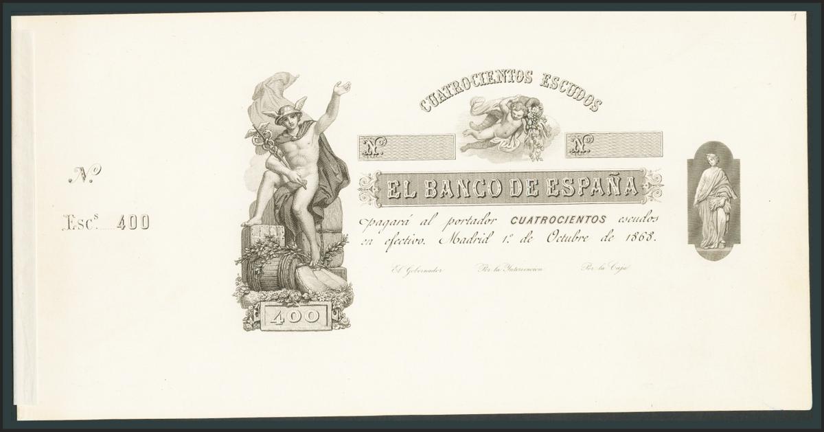 400 Escudos. 1 de Octubre de 1868. Sin serie. Prueba de anverso sin firma, sobre cartulina blanca. (Edifil 2021: 236P). Rarísima. SC.