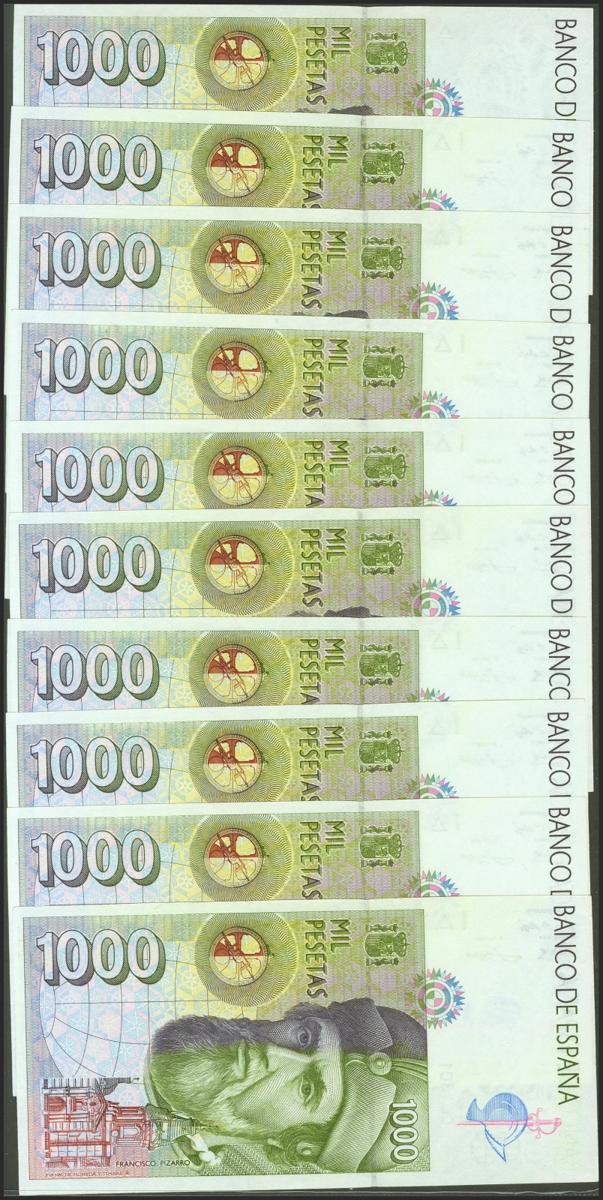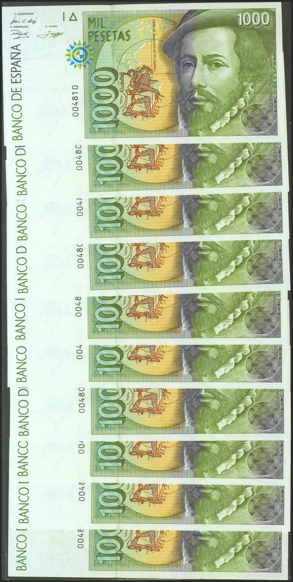 Conjunto de 10 billetes de 1000 Pesetas emitidos el 12 de Octubre de 1992 del Tipo I, sin serie y numeración muy baja (Edifil 2021: 483). SC.