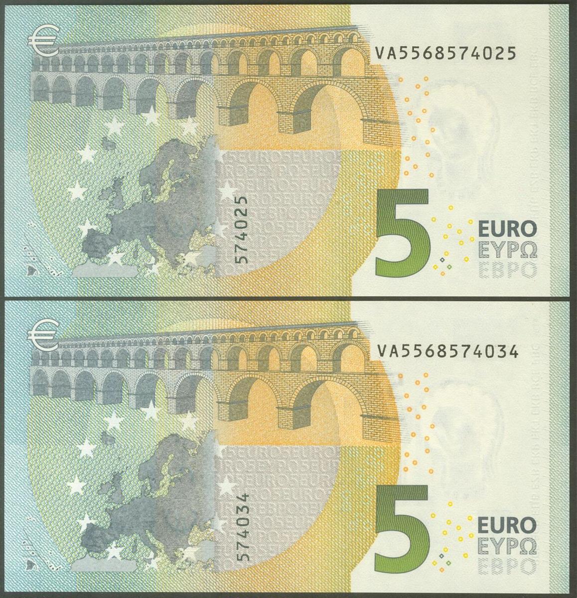 5 Euros. 2 de Mayo de 2013. Pareja correlativa (cabe recordar que el último dígito de la numeración de todos los billetes denominados en euros es para control interno del Banco Central Europeo, el que marca la correlatividad de los billetes es el penúltimo dígito). Firma Draghi. Serie V (España). (Edifil 2021: 493). SC.