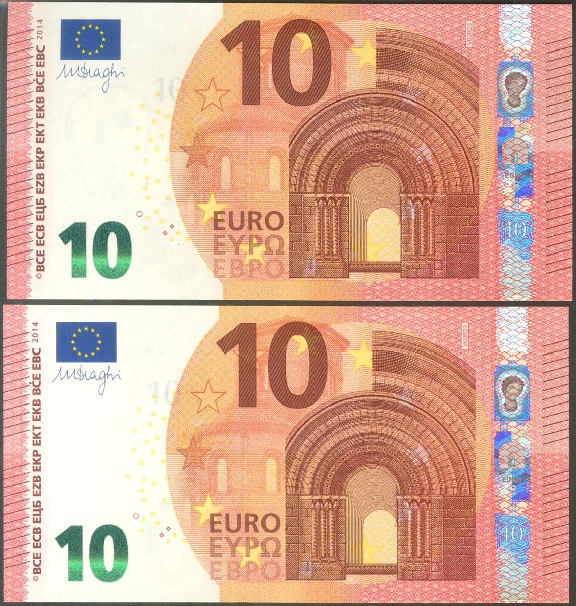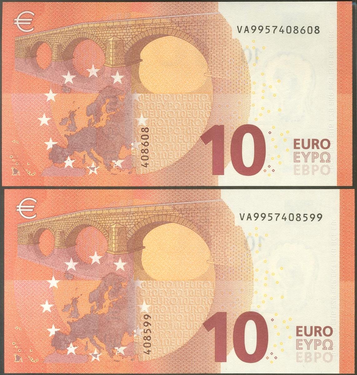 10 Euros. 23 de Septiembre de 2014. Pareja correlativa (cabe recordar que el último dígito de la numeración de todos los billetes denominados en euros es para control interno del Banco Central Europeo, el que marca la correlatividad de los billetes es el penúltimo dígito). Firma Draghi. Serie V (España). (Edifil 2021: 494). SC.