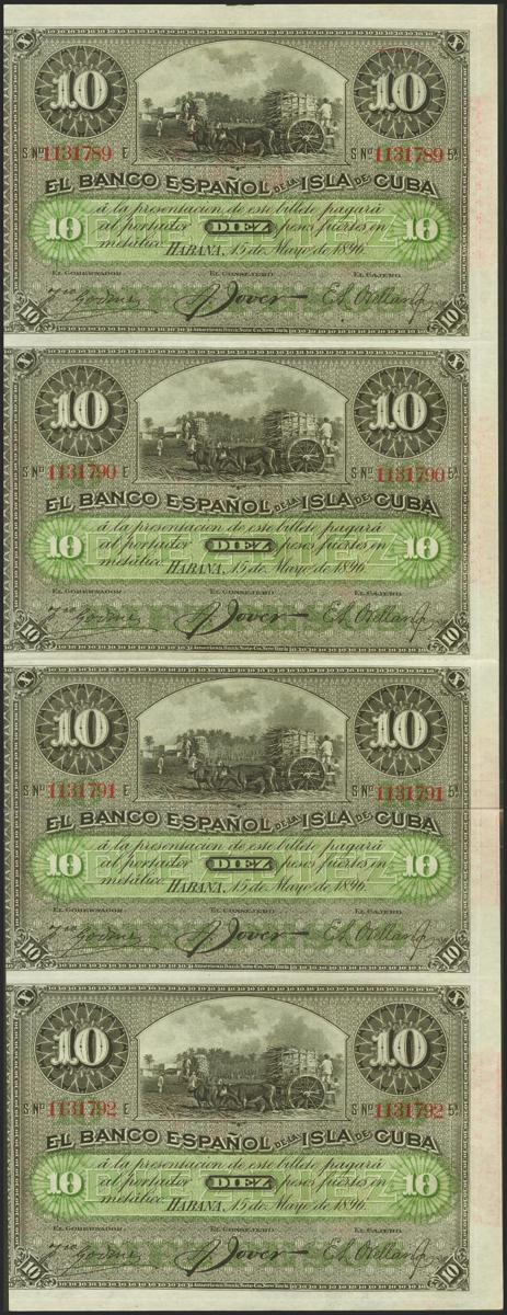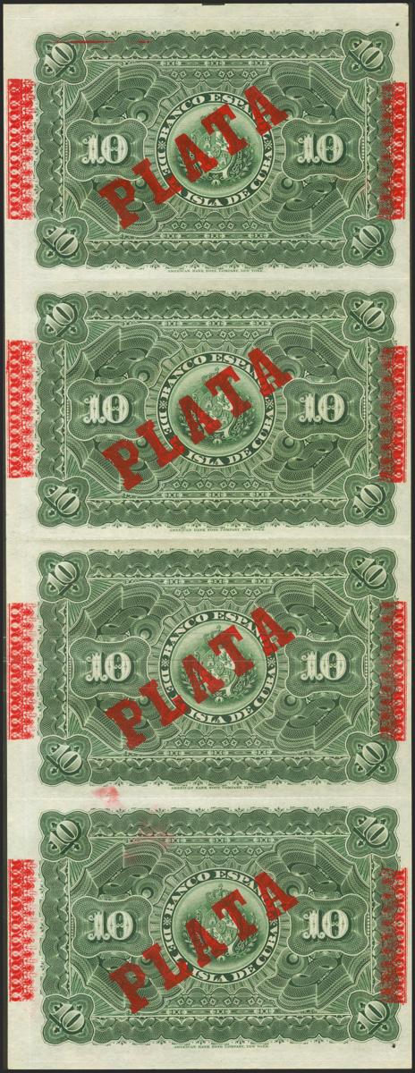 Conjunto de 4 billetes de 10 Pesos del Banco Español de Cuba emitidos el 15 de Mayo de 1896, todos correlativos y unidos verticalmente y al dorso sobrecarga PLATA. (Edifil 2021: 82). Apresto original, un billete punto de aguja, no se trata de un defecto, sino que todos los billetes de esa posición lo tienen debido al sistema de impresión. SC.