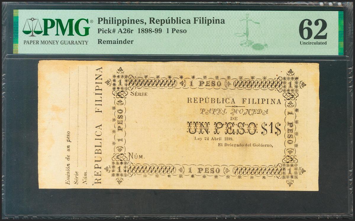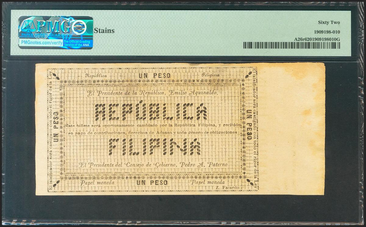 FILIPINAS. 1 Peso. 24 de Abril de 1899. República Filipina, insurrectos filipinos. Sin numeración y con matriz a la izquierda. (Pick: A26r). Muy raro. Encapculado 62 (stains). (para hacerse una idea de la calidad y rareza, a día 1 de Noviembre de 2021 en PMG este billete es el mejor graduado de los sólo 4 billetes reportados)