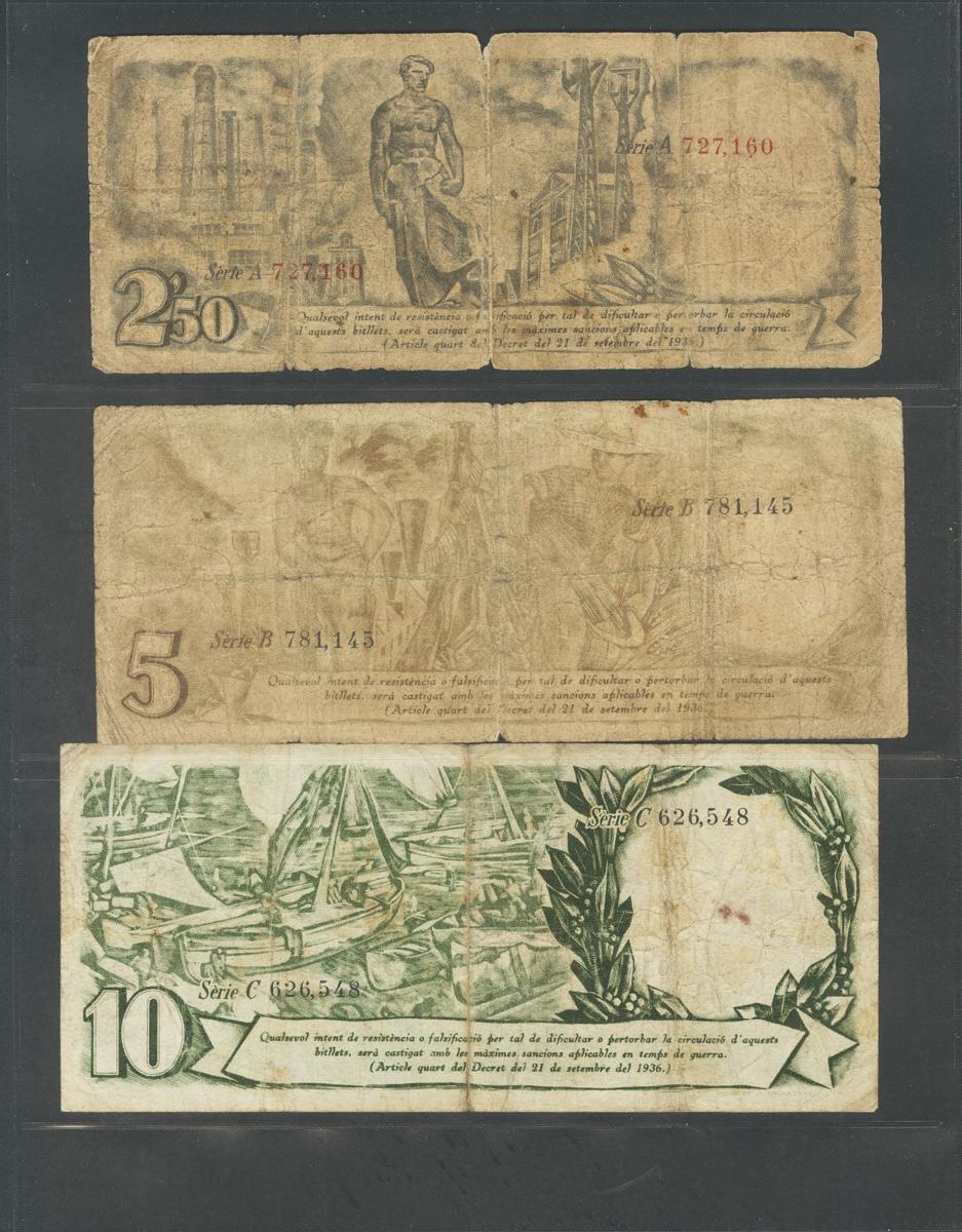 Conjunto de 10 billetes del Banco de España, 3 de la Generalitat de Cataluña y 2 sellos-moneda entre 1936 y 1953, de diferentes emisiones y en diversas calidades. A EXAMINAR.