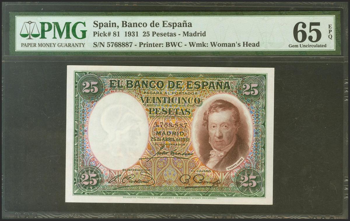 25 Pesetas. 25 de Abril de 1931. Sin serie. (Edifil 2021: 358, Pick: 81). Apresto original. SC. Encapsulado PMG65EPQ.
