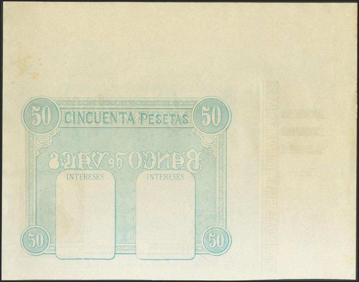 50 Pesetas. (1892ca). Banco de Valls. Prueba de Impresión, con matriz a la izquierda y sin texto. Serie B. (Ruíz y Alentorn: 931). SC-.