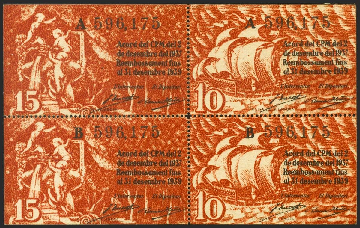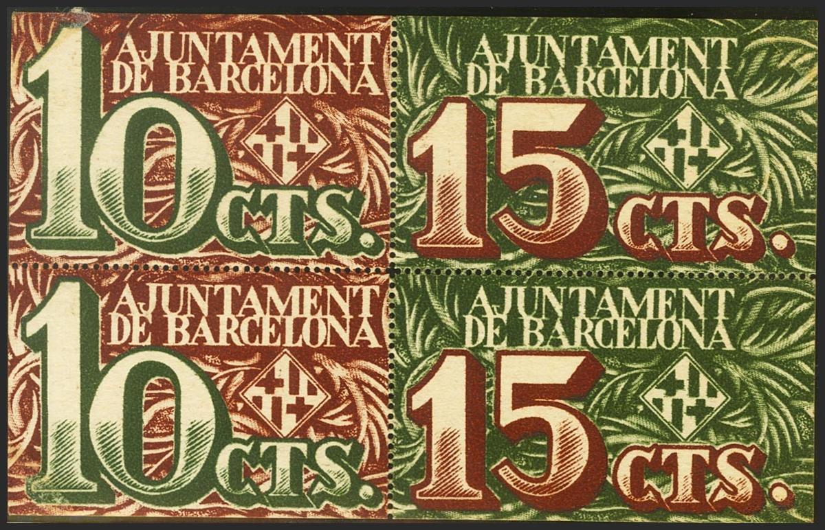 BARCELONA. 10 Céntimos (2) y 15 Céntimos (2), bloque de cuatro. 2 de Diciembre de 1937. Series A y B, respectivamente. (González: 6523/24). SC.