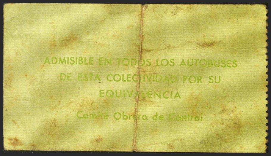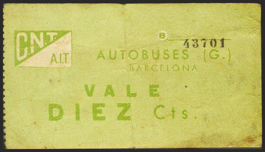 BARCELONA. 10 Céntimos. (1936ca). Autobuses CNT. (González: 6545). Inusual. MBC.