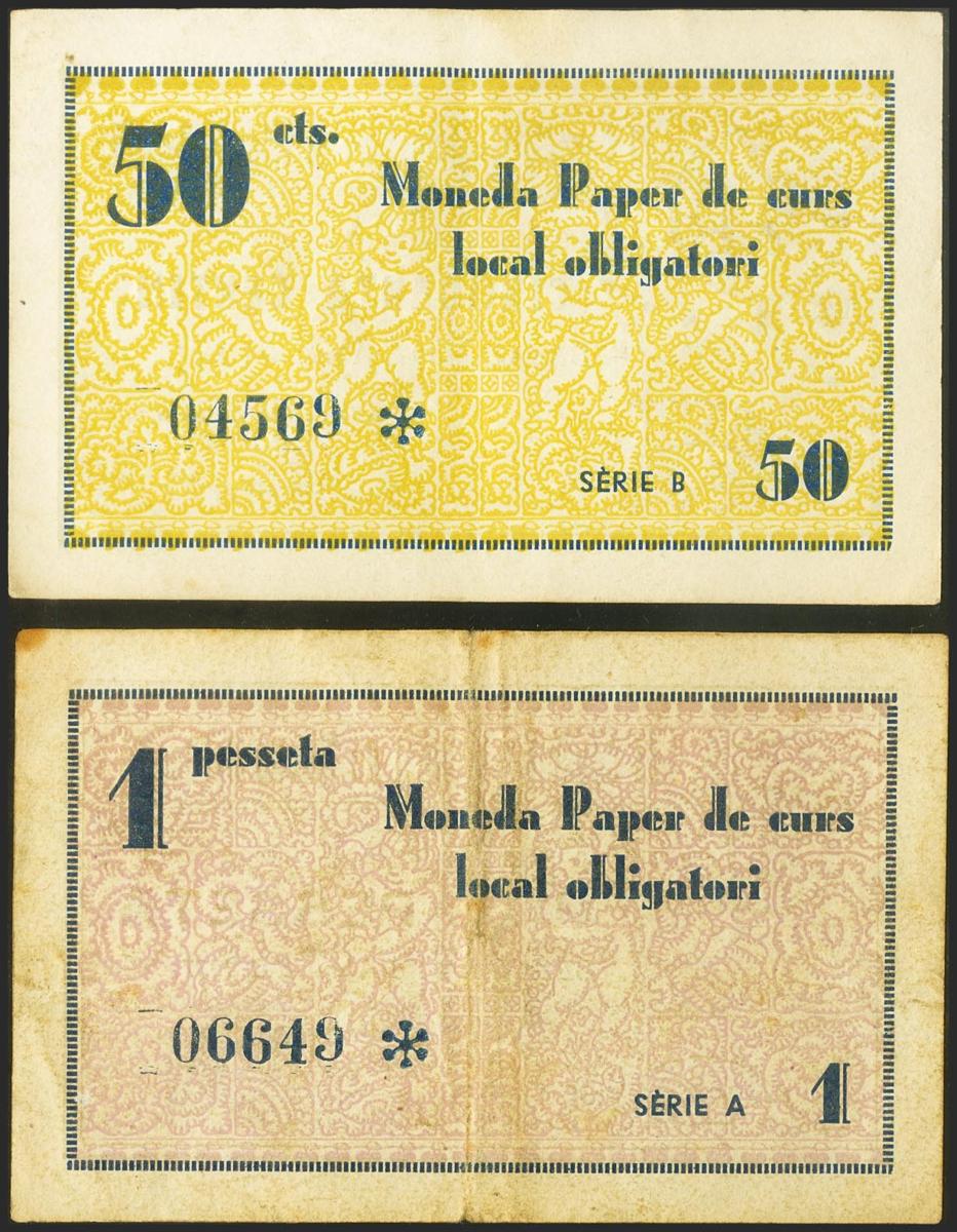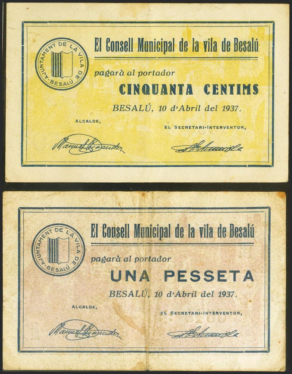 BESALU (GERONA). 50 Céntimos y 1 Peseta. 10 de Abril de 1937. Serie B y A, respectivamente. (González: 7043/44). Inusual serie completa. EBC/MBC.