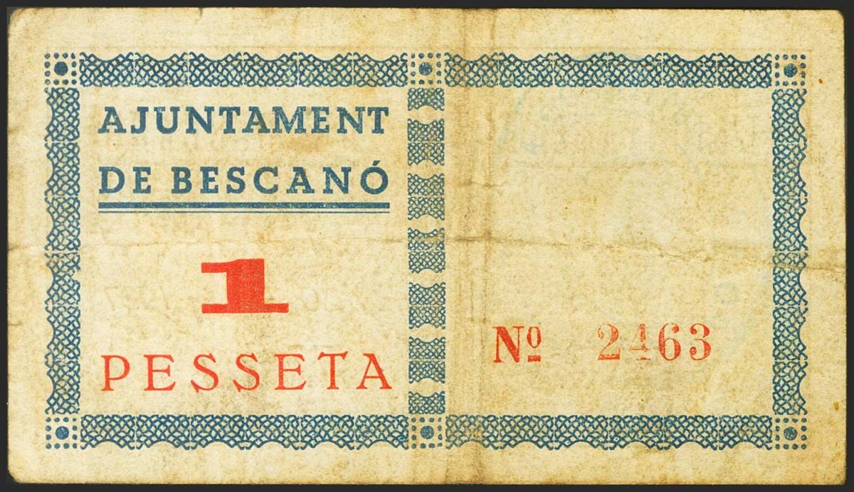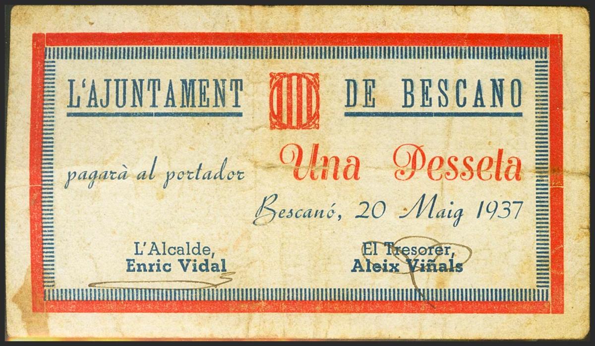 BESCANO (GERONA). 1 Peseta. 20 de Mayo de 1937. (González: 7045). Raro. MBC.
