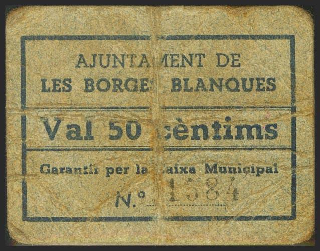 LES BORGES BLANQUES (LERIDA). 50 Céntimos. (1936ca). (González: 7143). Raro. BC+.