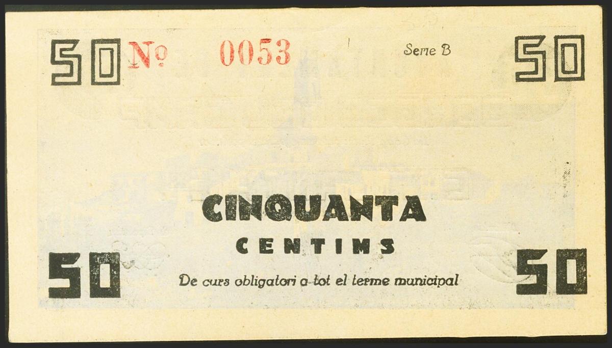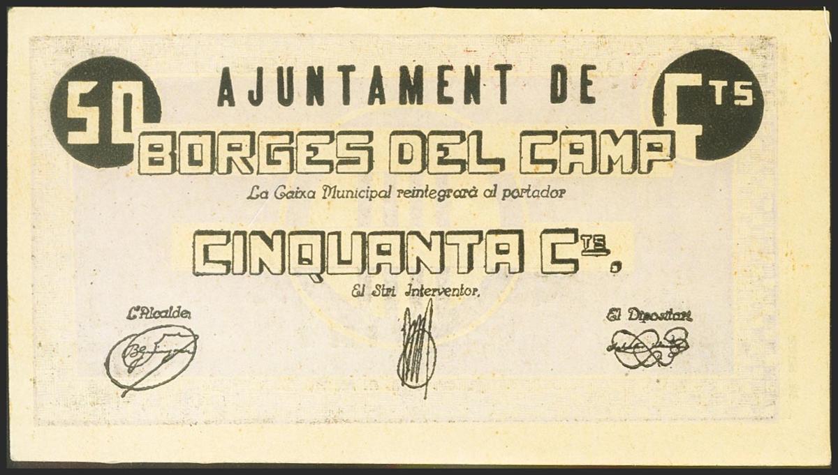 LES BORGES DEL CAMP (TARRAGONA). 50 Céntimos. (1936ca). Serie B y variedad de impresión. (González: 7164). Raro. EBC.