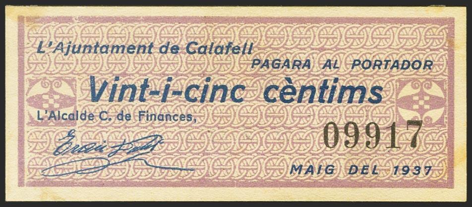 CALAFELL (TARRAGONA). 25 Céntimos. Mayo 1937. (González: 7270). SC-.