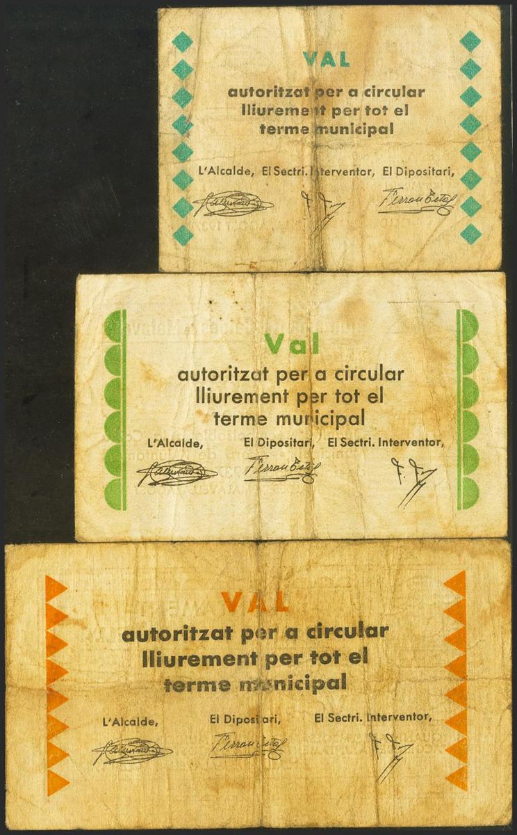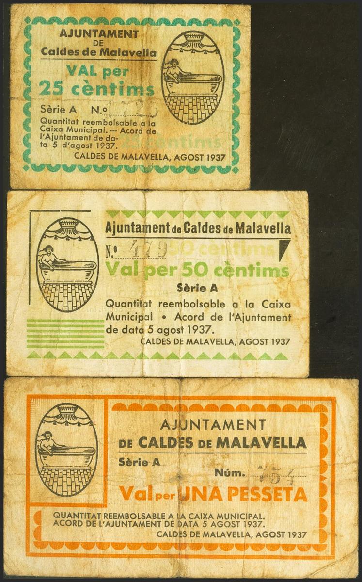 CALDES DE MALAVELLA (GERONA). 25 Céntimos, 50 Céntimos y 1 Peseta. 5 de Agosto de 1937. Serie A, los tres billetes. (González: 7278/80). Rara serie completa. MBC.