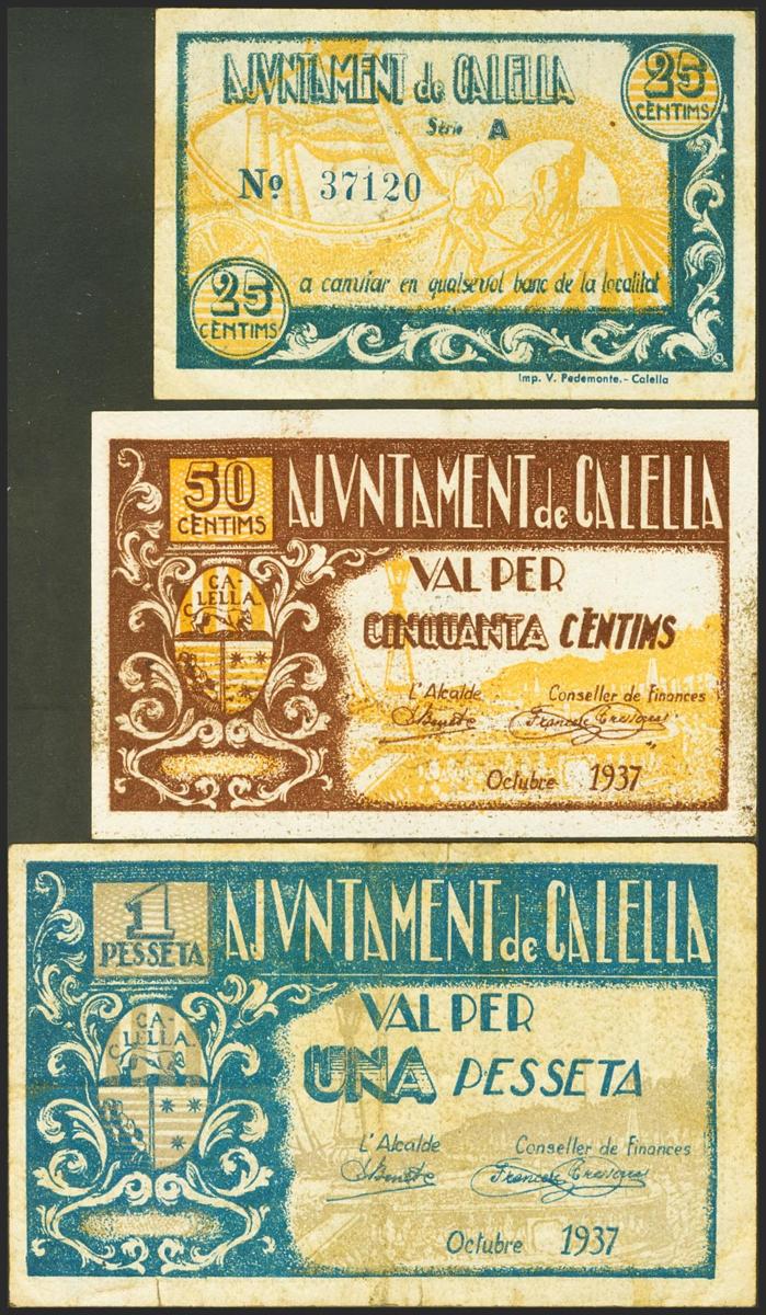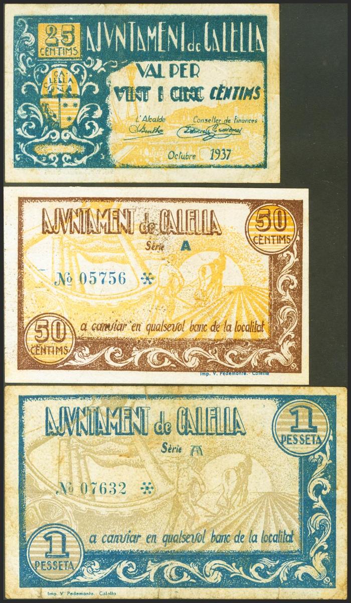 CALELLA (BARCELONA). 25 Céntimos, 50 Céntimos y 1 Peseta. Octubre 1937. Serie A, los tres billetes. (González: 7290/92). Rara serie completa. MBC/MBC+.