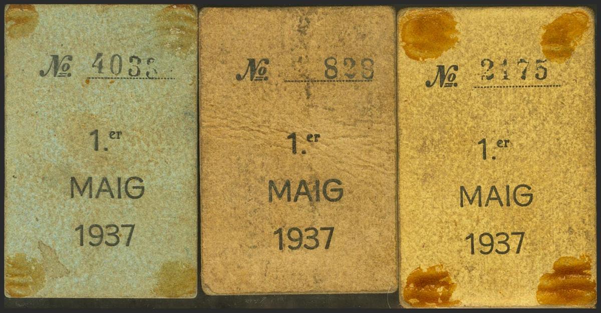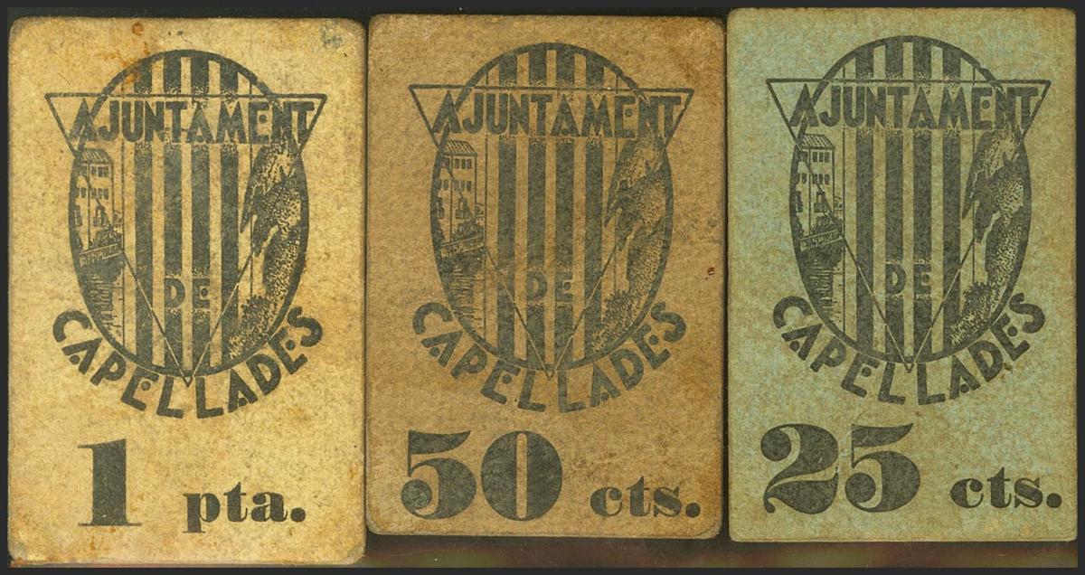 CAPELLADES (BARCELONA). 25 Céntimos, 50 Céntimos y 1 Peseta. 1 de Mayo de 1937. (González: 7375/77). Rara serie completa. EBC.