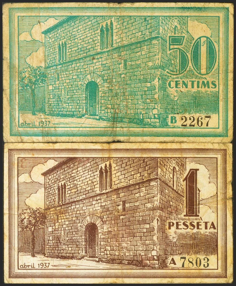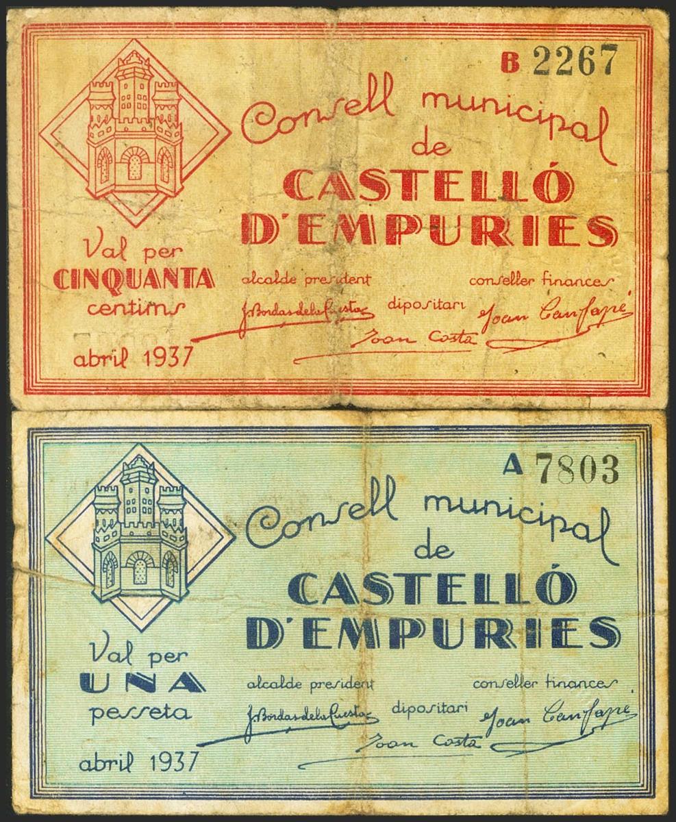 CASTELLO D´EMPURIES (GERONA). 50 Céntimos y 1 Peseta. Abril 1937. Serie B y A, respectivamente. (González: 7483/84). Serie completa. BC.