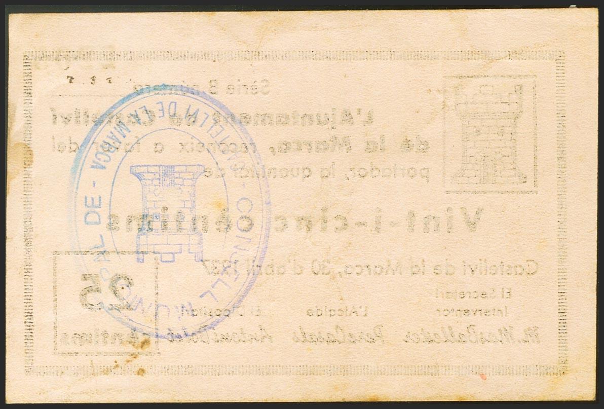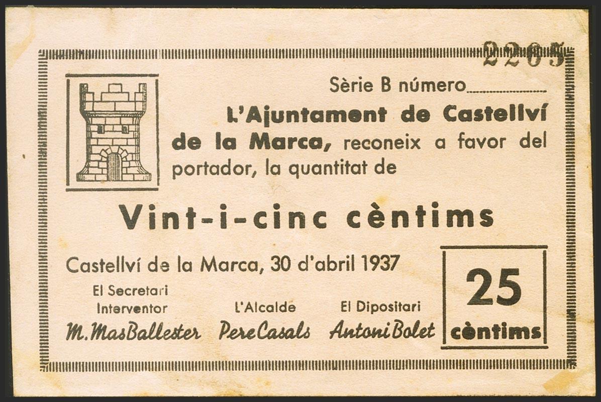 CASTELLVI DE LA MARCA (BARCELONA). 25 Céntimos. 30 de Abril de 1937. Serie B. (González: 7522). Muy raro. MBC+.