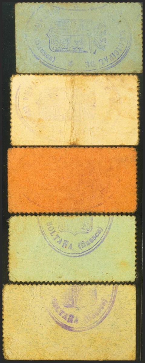 BOLTAÑANA (HUESCA). 5 Céntimos, 10 Céntimos, 25 Céntimos, 50 Céntimos y 1 Peseta. (1936ca). (González:1262/66). Rarísima serie completa. MBC/MBC+.