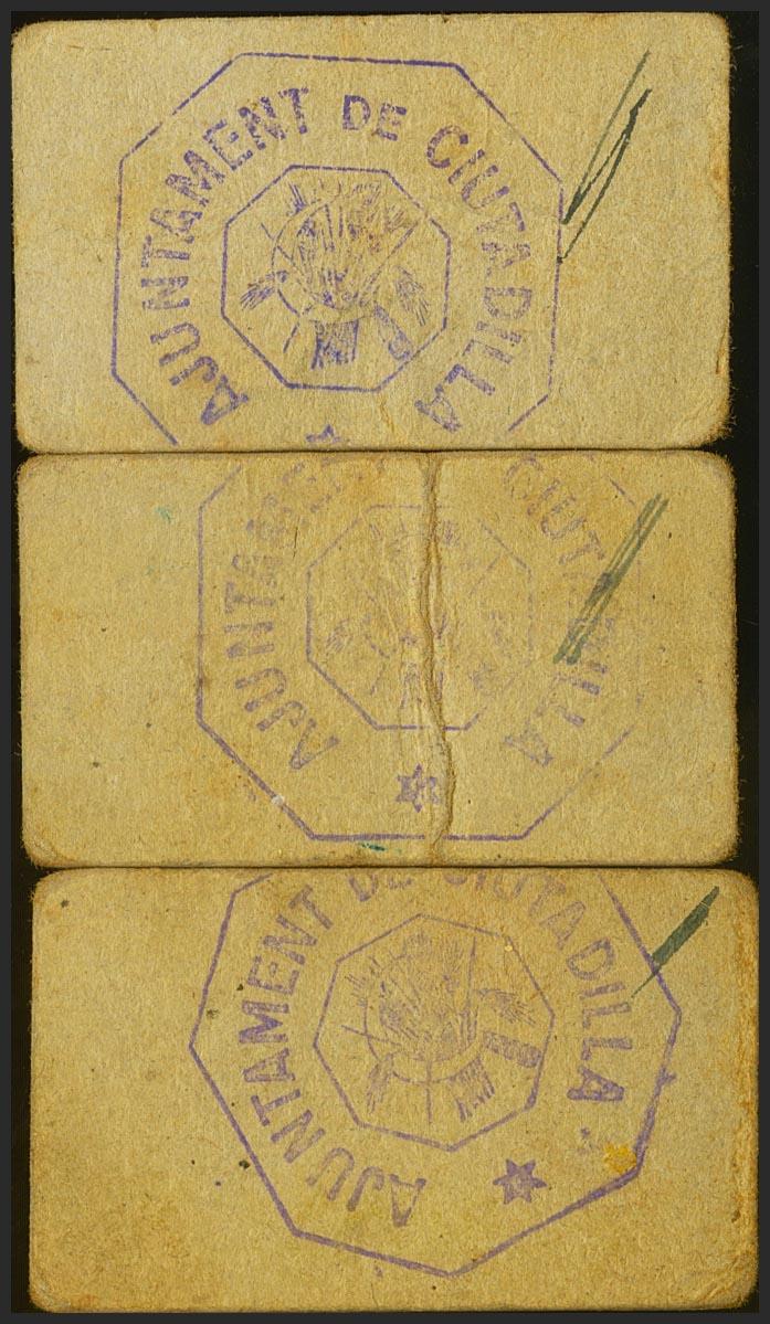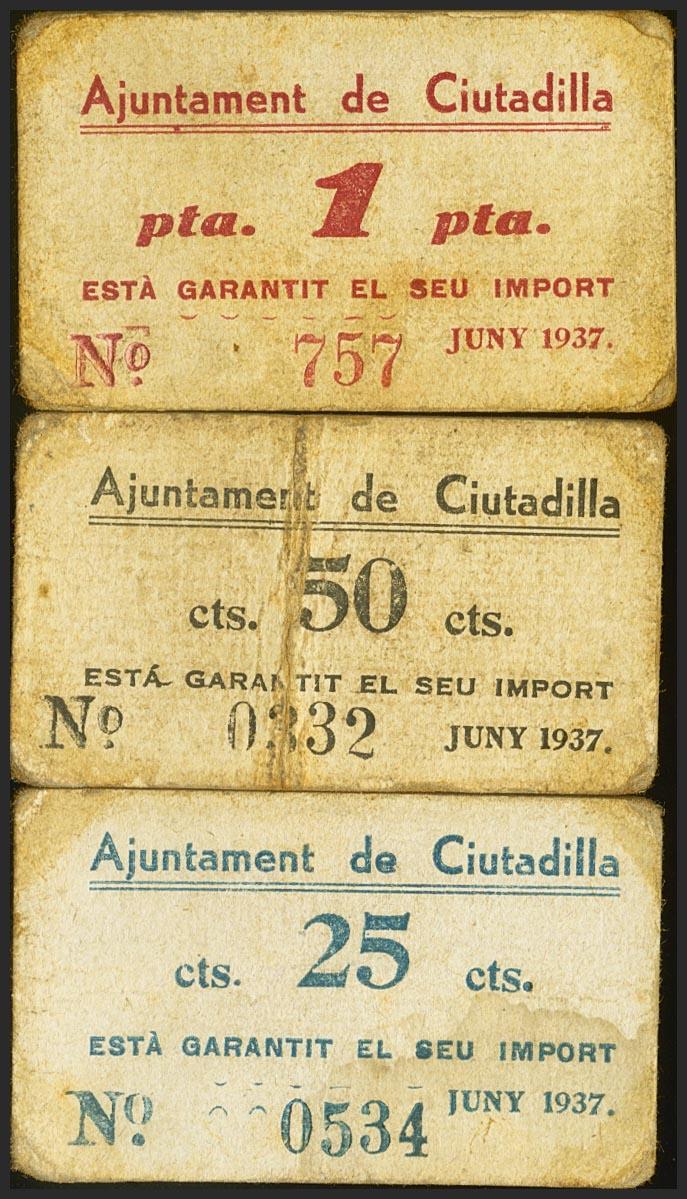 CIUTADILLA (LERIDA). 25 Céntimos, 50 Céntimos y 1 Peseta. Junio 1937. (González: 7603, 7604, 7607). Rarísimos. MBC/MBC+.
