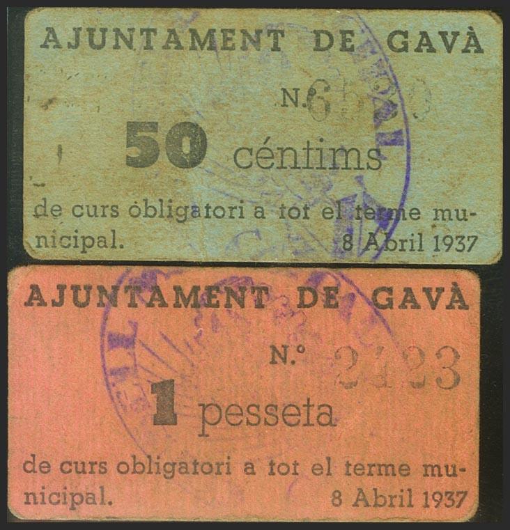 GAVA (BARCELONA). 50 Céntimos y 1 Peseta. 8 de Abril de 1937. (González: 7997/98). Rara serie completa. MBC+.