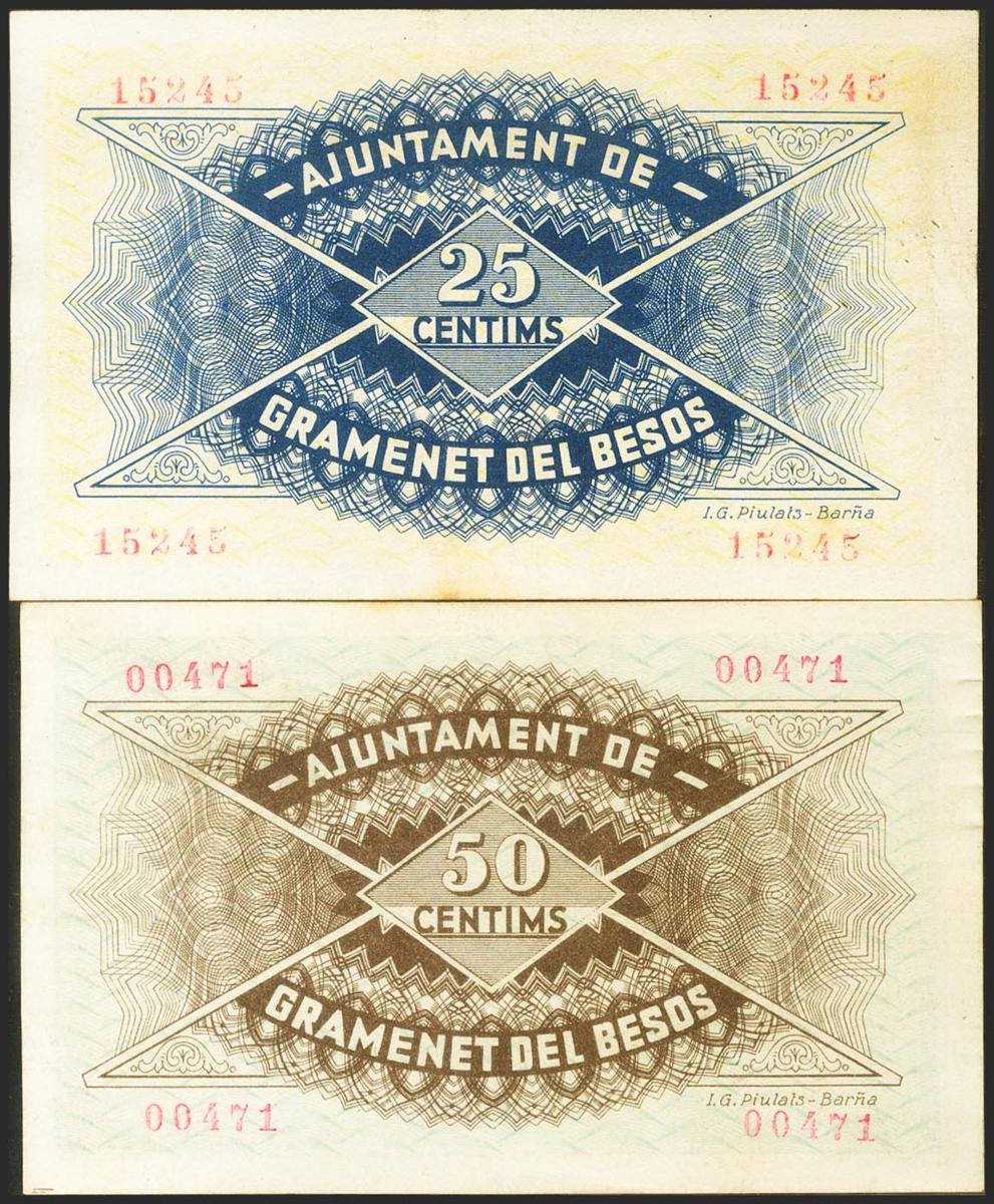 GRAMANET DEL BESOS (BARCELONA). 25 Céntimos y 50 Céntimos. 30 de Julio de 1937. (González: 8076/77). Serie completa. MBC+.