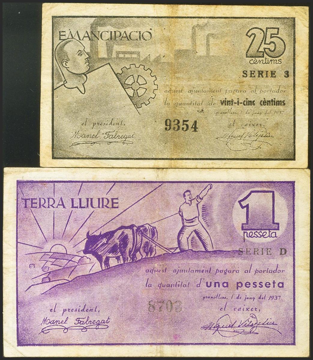 GRANOLLERS (BARCELONA). 25 Céntimos y 1 Peseta. 1 de Junio de 1937. Serie 3 y D, respectivamente. (González: 8111/12). Serie completa. MBC.