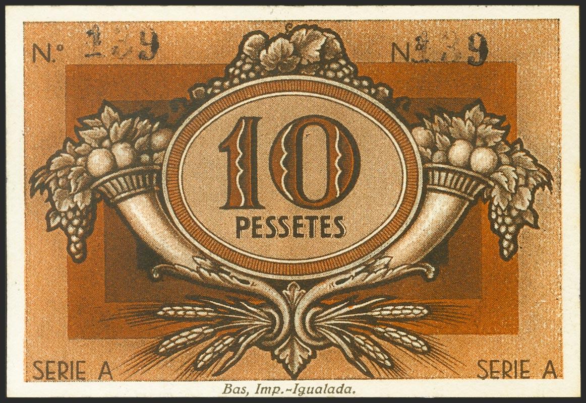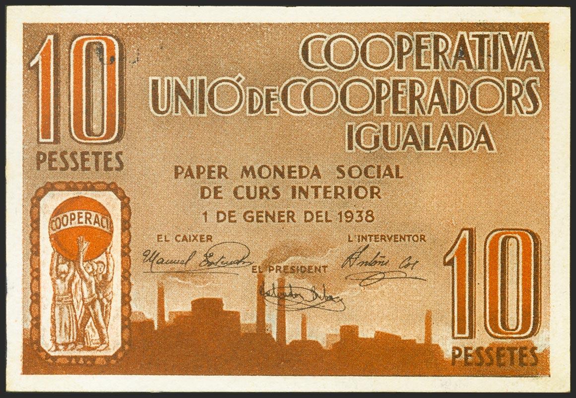 IGUALADA (BARCELONA). 10 Pesetas. 1 de Enero de 1938. Cooperativa Unio de Cooperadors Igualada. Serie A. (González: 8256). SC-.