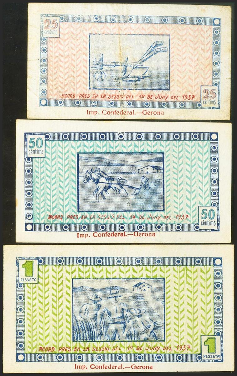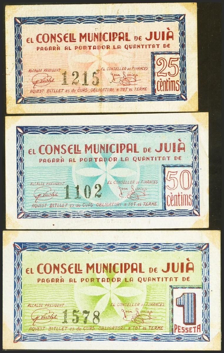 JUIA (GERONA). 25 Céntimos, 50 Céntimos y 1 Peseta. 1 de Junio de 1937. (González: 8287/89). Inusual serie completa. SC-/EBC.