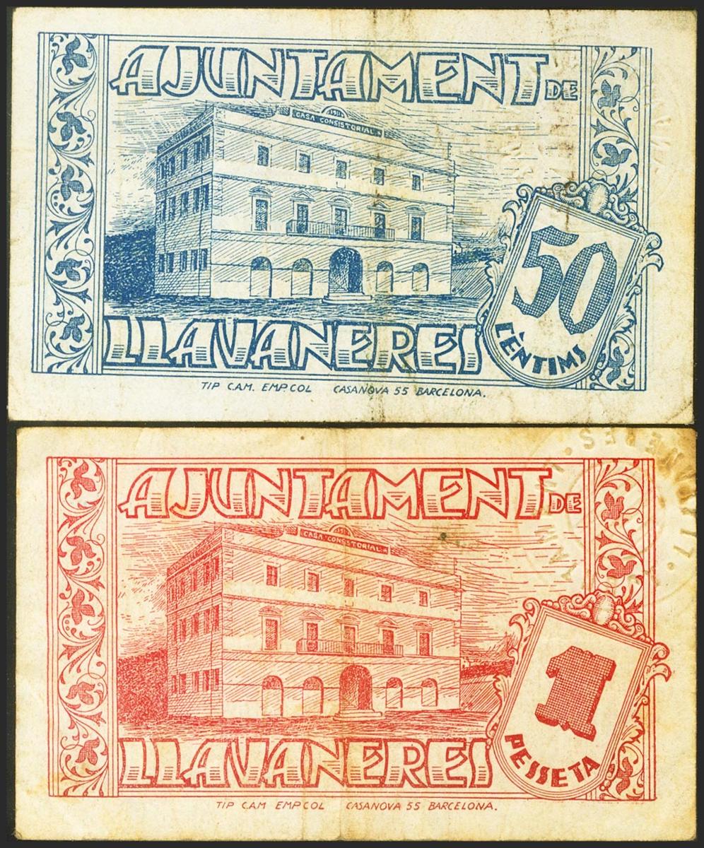 LLAVANERES (BARCELONA). 50 Céntimos y 1 Peseta. (1936ca). (González: 8349/50). Inusual serie completa. MBC/MBC+.