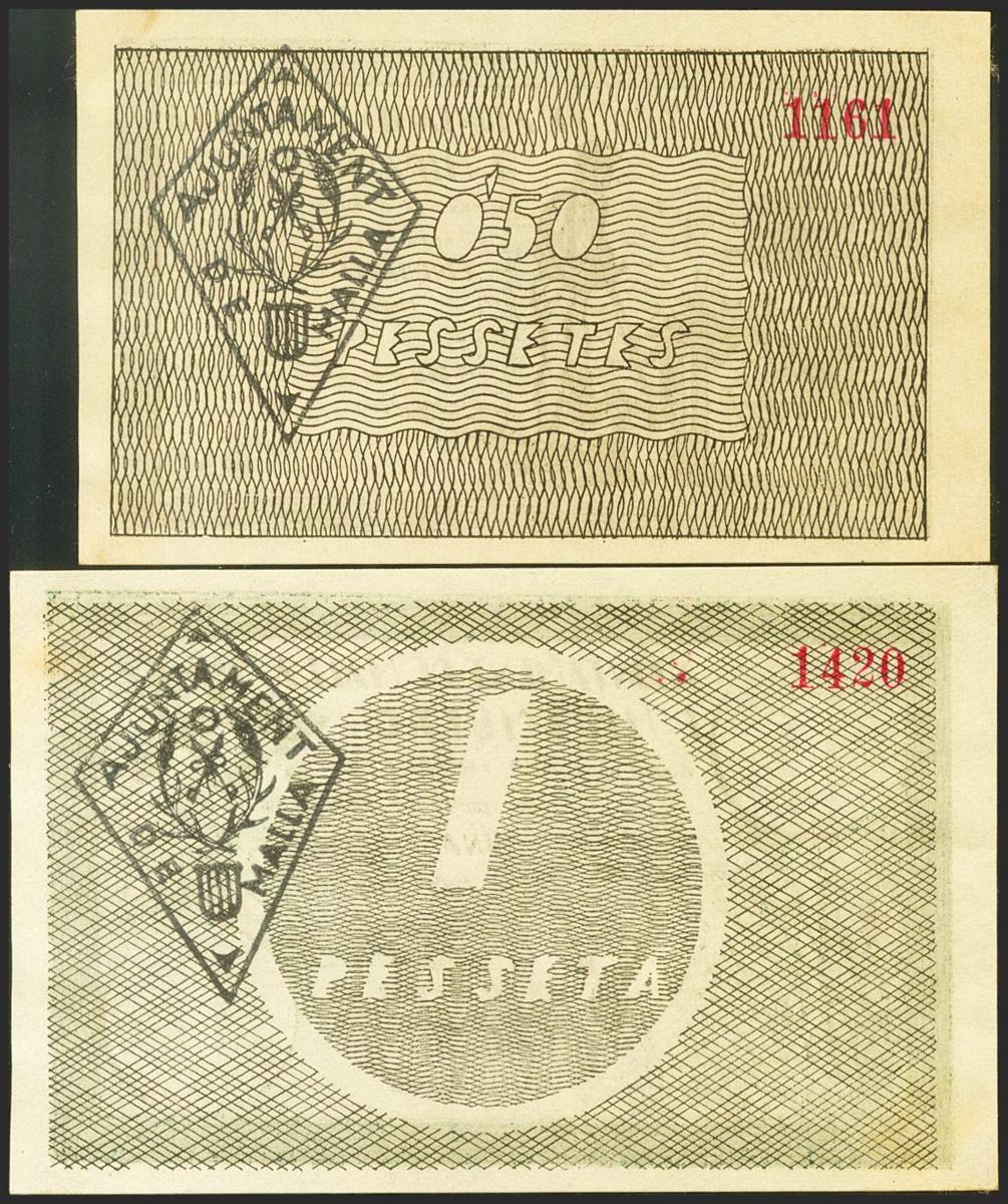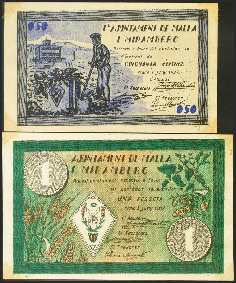 MALLA I MIRANBERC (BARCELONA). 50 Céntimos y 1 Peseta. 1 de Junio de 1937. (González: 8485/86). Rara serie completa. EBC+.