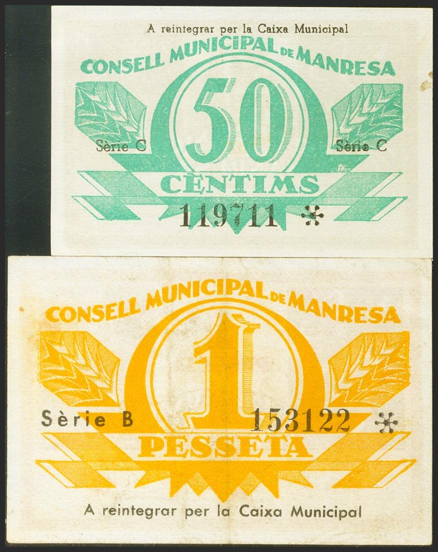 MANRESA (BARCELONA). 50 Céntimos y 1 Peseta. (1936ca). Serie C y B, respectivamente. (González: 8494/95). Serie completa. EBC.