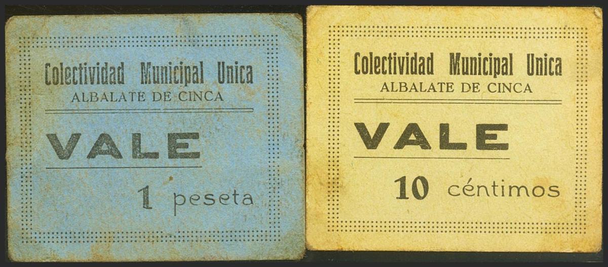 ALBALATE DE CINCA (TERUEL). 10 Céntimos y 1 Peseta. (1936ca). (González: 162, 165). Muy raros. MBC+.