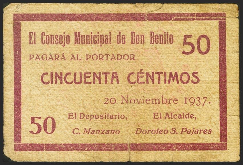 DON BENITO (BADAJOZ). 50 Céntimos. 20 de Noviembre de 1937. (González: 2239). Inusual. MBC.