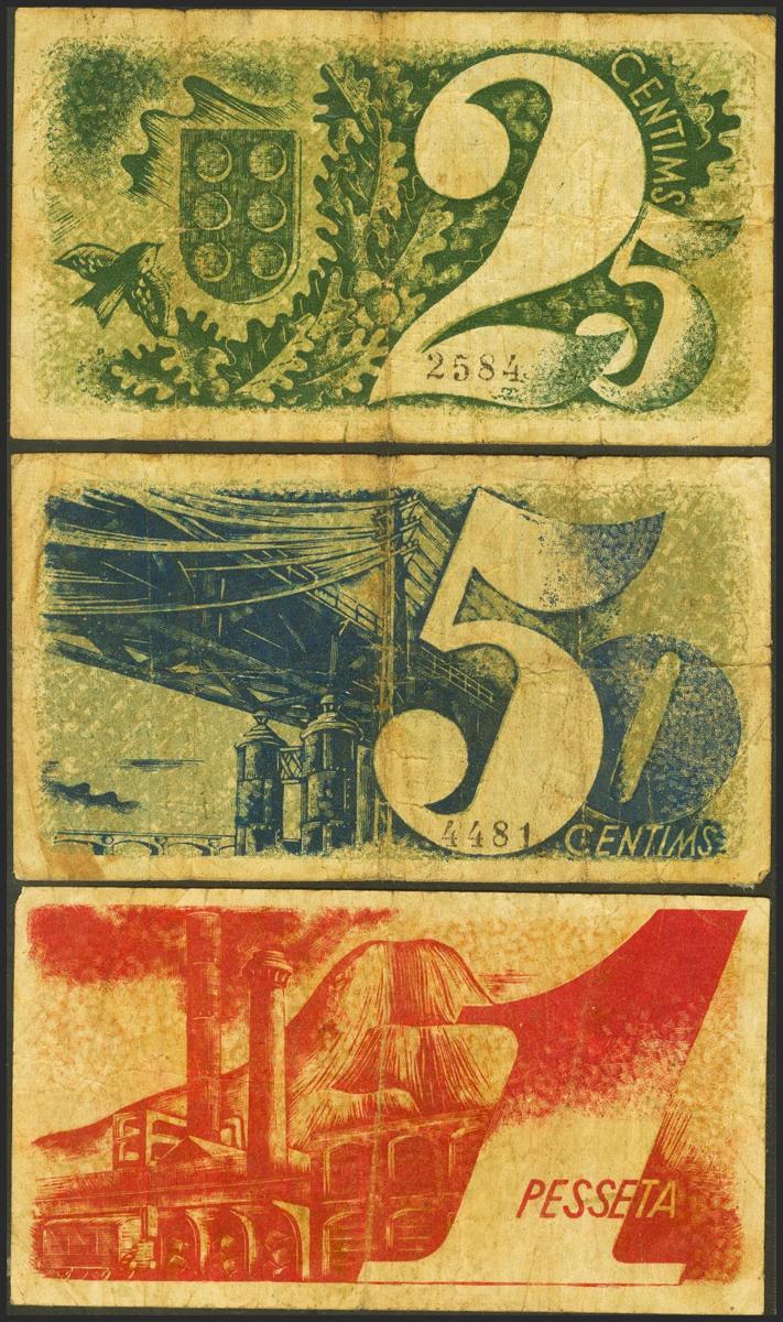 MONTCADA Y REIXAC (BARCELONA). 25 Céntimos, 50 Céntimos y 1 Peseta. Mayo 1937. (González: 8773/75). Inusual serie completa. MBC/MBC+.