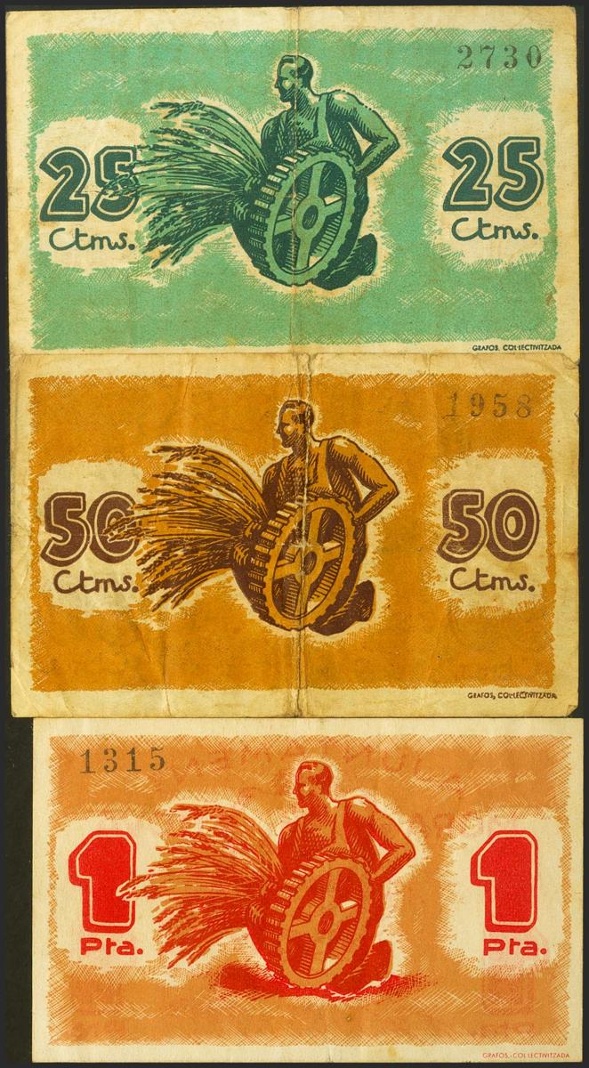 MORA LA NOVA (TARRAGONA). 25 Céntimos, 50 Céntimos y 1 Peseta. (1936ca). (González: 8847/49). Inusual serie completa. MBC/MBC+.
