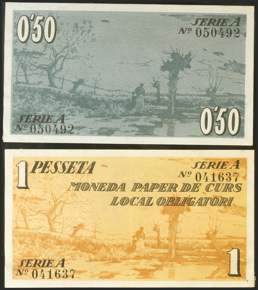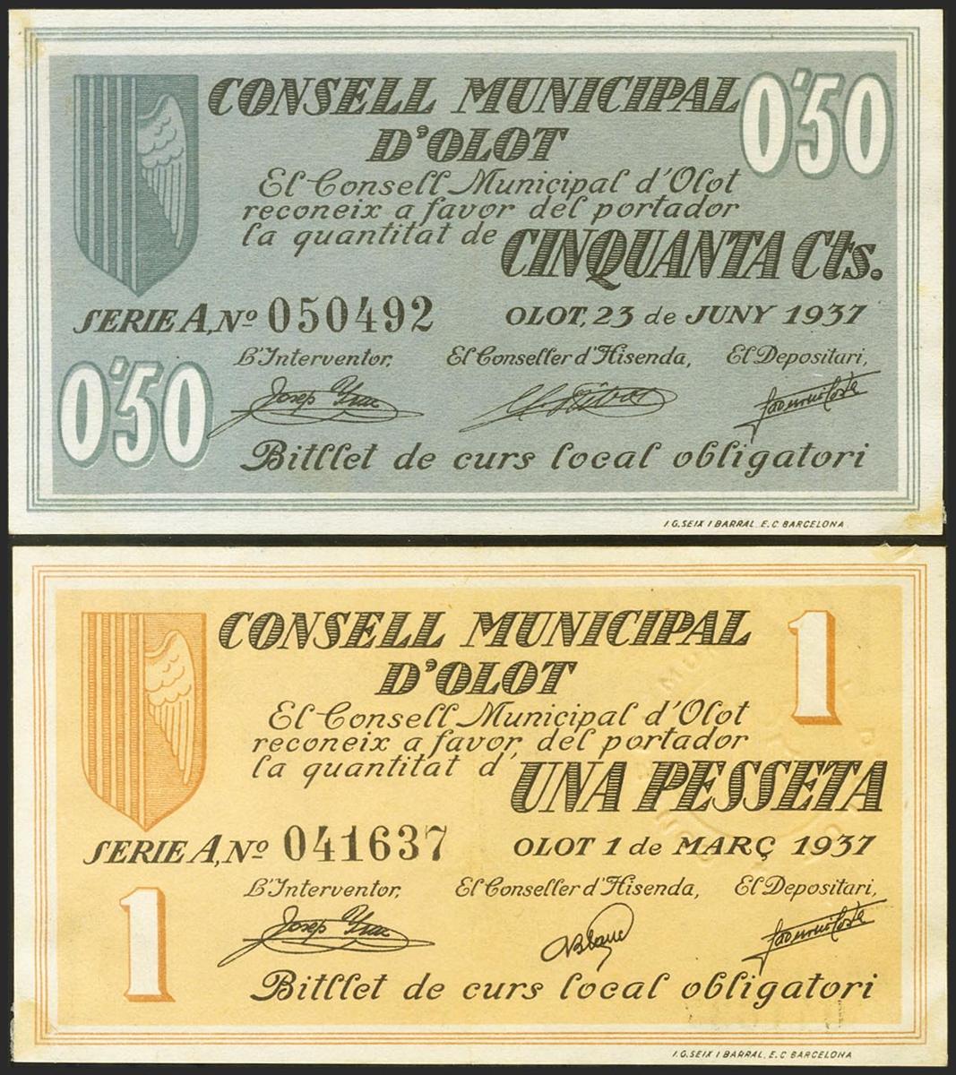 OLOT (GERONA). 50 Céntimos y 1 Peseta. 23 de Junio de 1937. Serie A, ambas. (González: 8952/53). Serie completa. EBC.