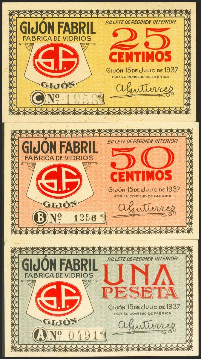 GIJON (ASTURIAS). 25 Céntimos, 50 Céntimos y 1 Peseta. 15 de Julio de 1937. Gijón Fabril Fábrica de Vidrios. (González: 2659/61). Inusual serie completa. EBC+.