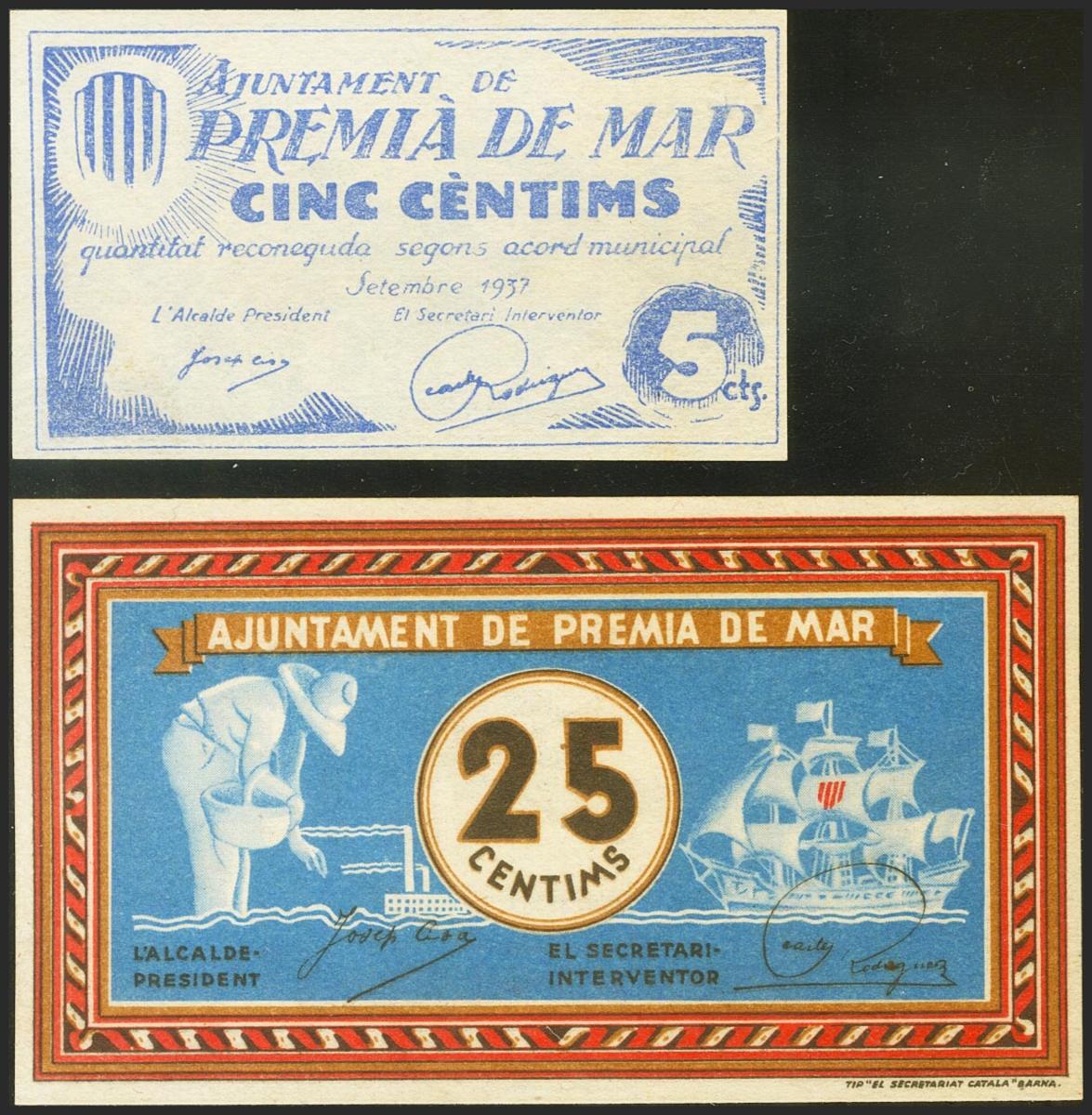 PREMIA DE MAR (BARCELONA). 5 Céntimos y 25 Céntimos. Septiembre 1937. (González: 9467, 9468). SC.