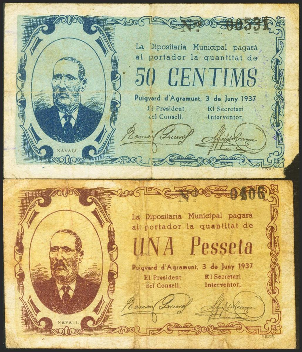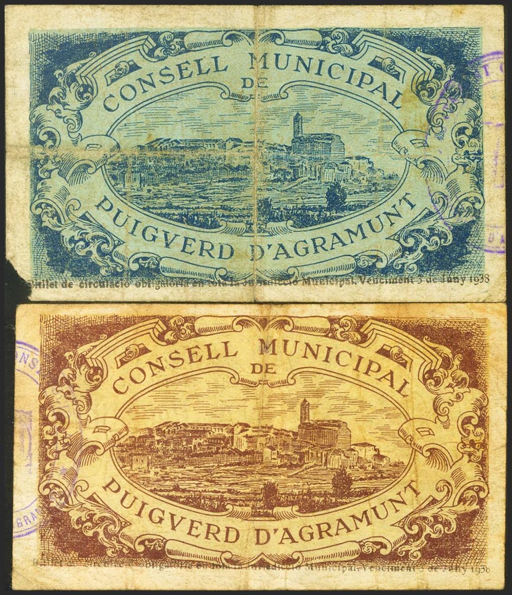 PUIGVERD D´AGRAMUNT (LERIDA). 50 Céntimos y 1 Peseta. 3 de Junio de 1937. (González: 9509/10). Muy rara serie completa. BC.