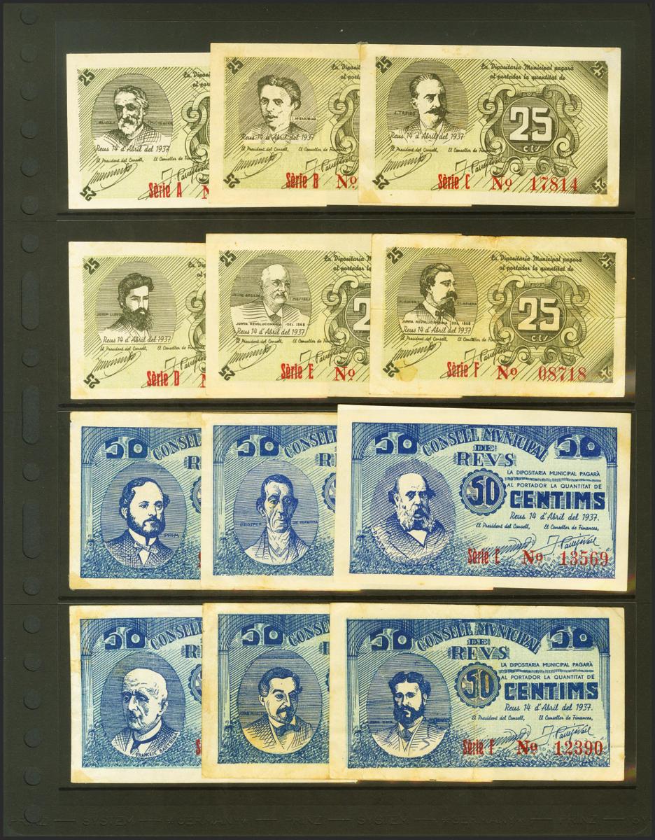 REUS (TARRAGONA). Conjunto de la serie completa de 16 billetes emitidos el 14 de Abril de 1937, incluyendo todas las series desde la A a la F. (González: 9548/63). Raro conjunto completo (excepto el 1 pts emitido el 14 de Abril de 1937, serie B), especialmente en una buena calidad. EBC/MBC+.