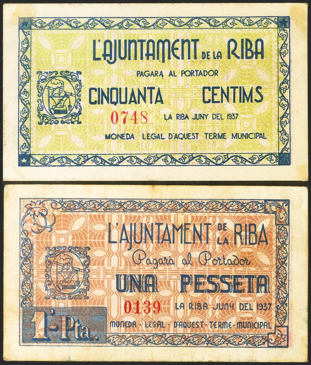 LA RIBA (TARRAGONA). 50 Céntimos y 1 Peseta. Junio 1937. (González: 9601, 9602). Raro. MBC+.