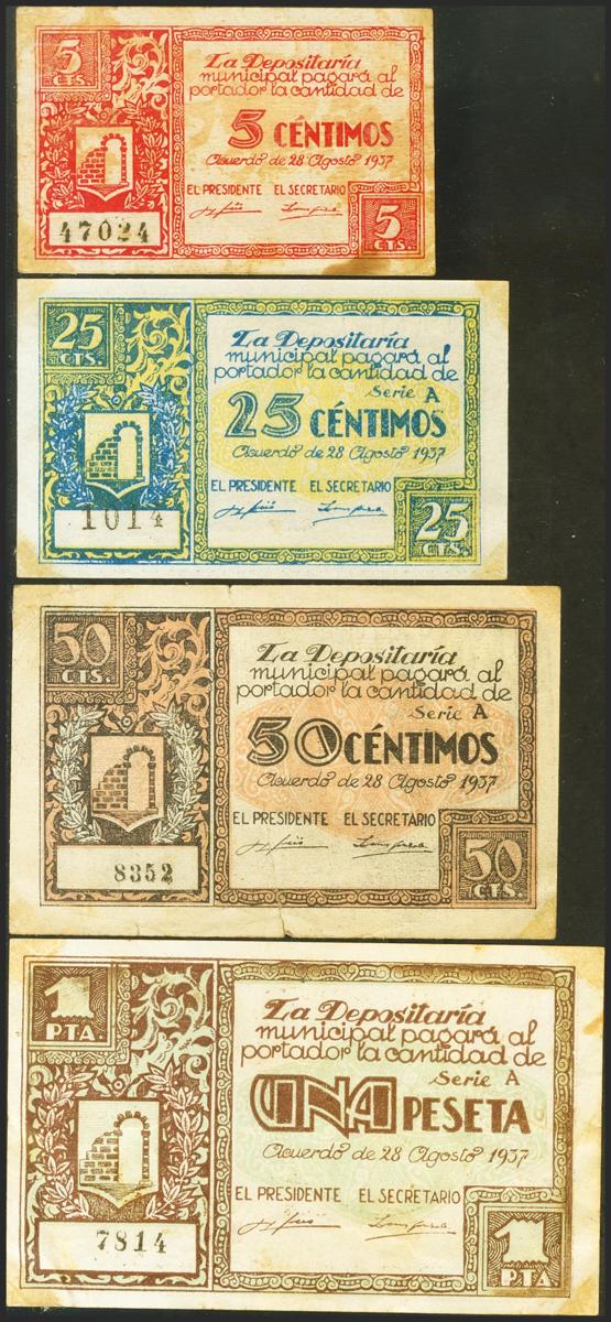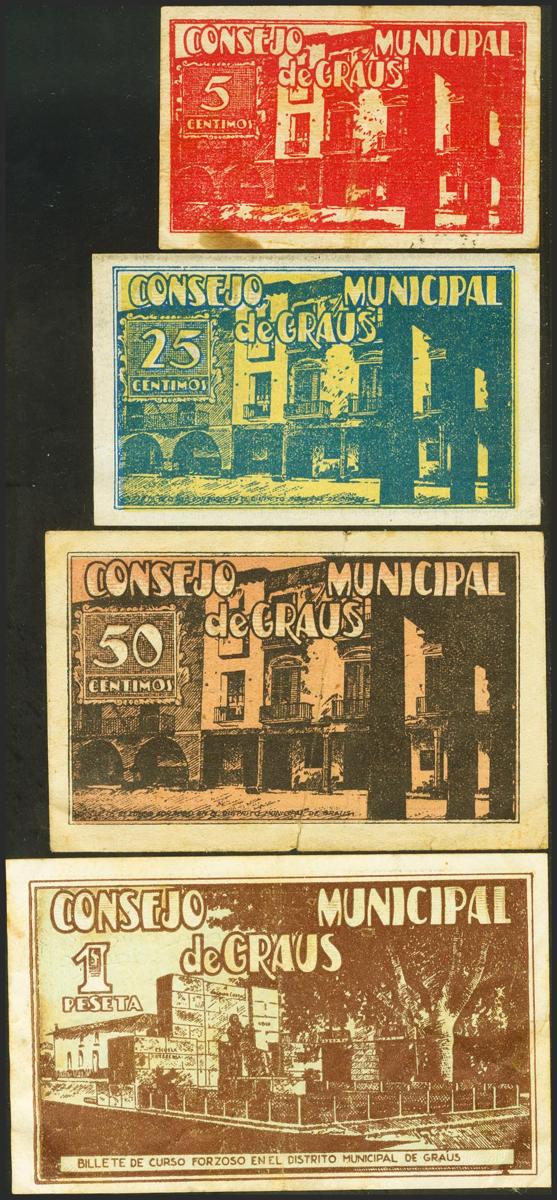 GRAUS (HUESCA). 5 Céntimos, 25 Céntimos, 50 Céntimos y 1 Peseta. 28 de Agosto de 1937. Serie A, todos los valores excepto el 5 cts. (González: 2726/29). Inusual serie completa. MBC/MBC+.