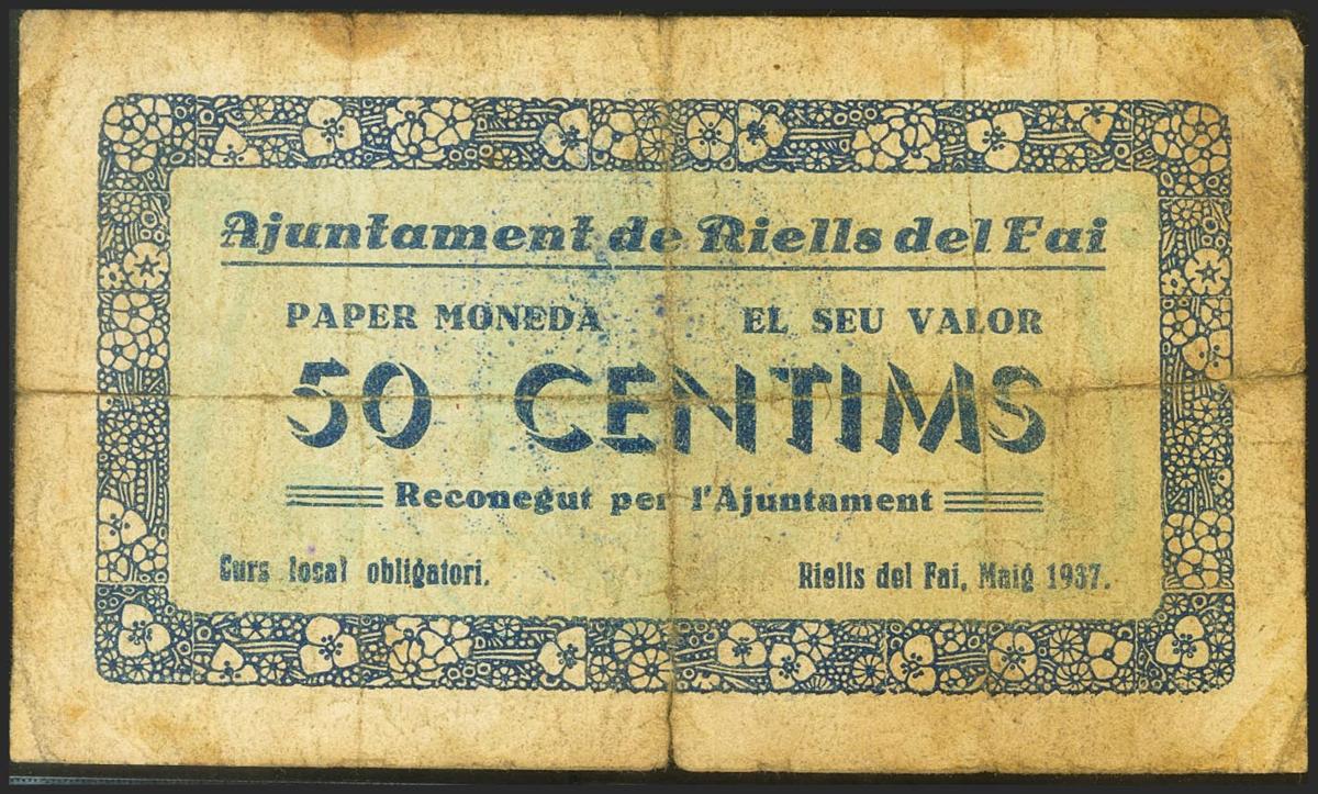 RIELLS DE FAI (BARCELONA). 50 Céntimos. Mayo 1937. (González: 9628). Muy raro. MBC-.