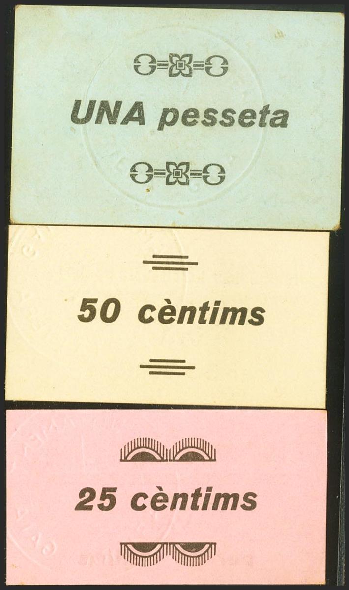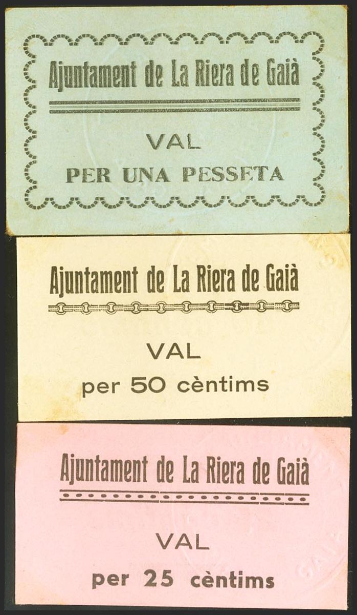 RIERA DE GAIA (TARRAGONA). 25 Céntimos, 50 Céntimos y 1 Peseta. (1936ca). (González: 9639/41). Rara serie completa. EBC+.